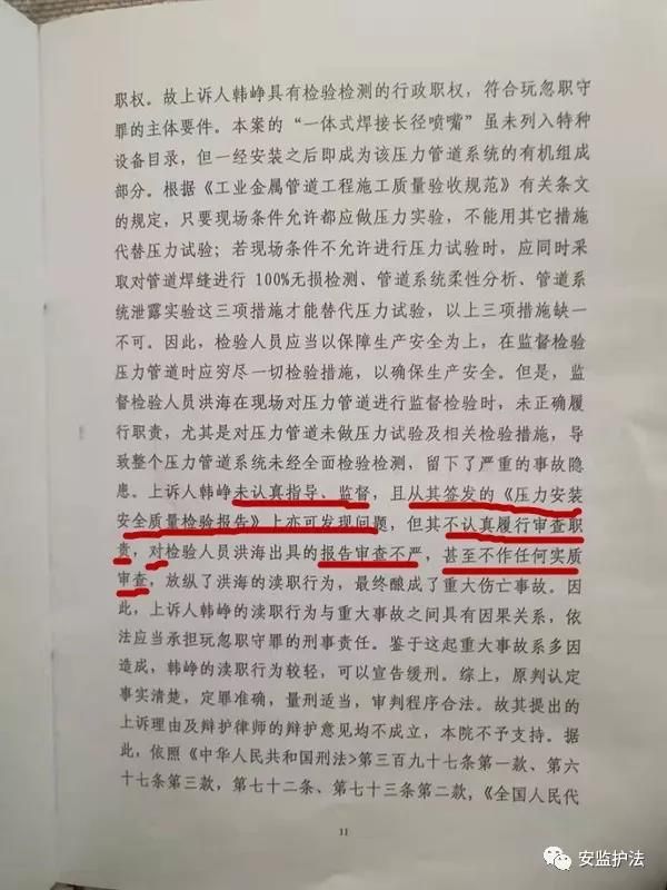 二审法院认定“上诉人韩峥未认真指导、监督,且从其签发的《压力管道安装安全质量检验报告》上亦可发现问题,但其不认真履行审查职责,对检验人员洪海出具的报告审查不严,甚至不作任何实质性审查,放纵了洪海的渎职行为”,认定事实不清、证据不足。