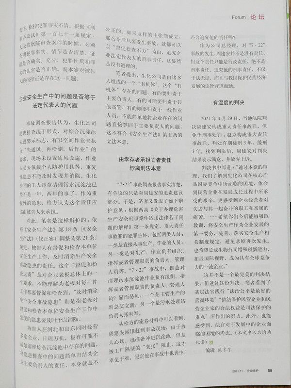 我注意到事故报告指出了生化公司存在的诸多问题,检方也一直拿这些问题来说事,但是生化公司的问题不能简单等同于法定代表人的问题。于是我又补充道:生化公司是由诸多人组成的一个“有机体”,这个“有机体”存在的问题,有的要归责于主要负责人,有的可能要归责于其他高管,有的则要归责于一线作业人员,不能简单的将企业存在的问题直接等同于主要负责人的问题,这不符合《安全生产法》第五条的立法本意。